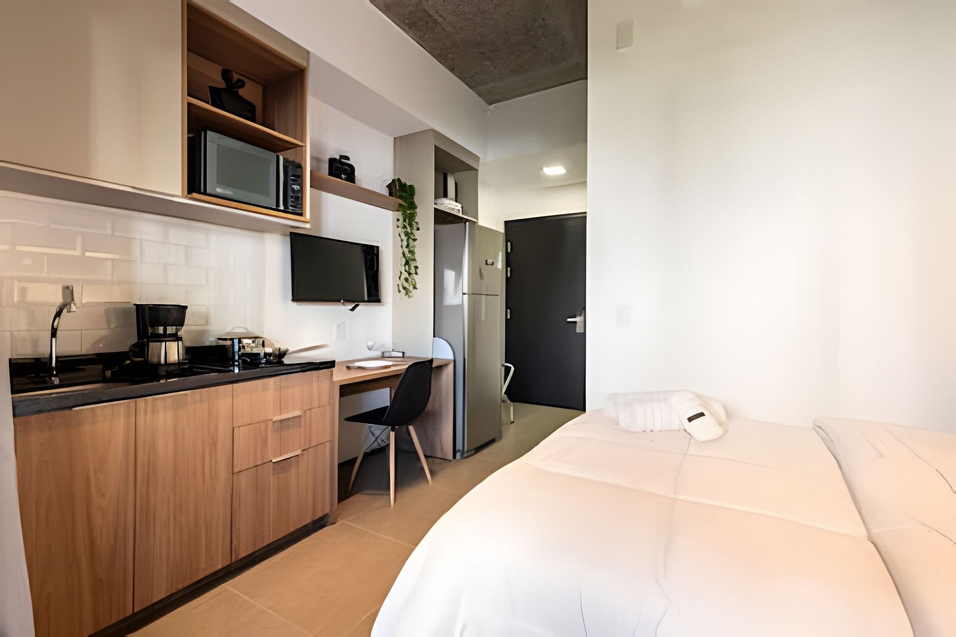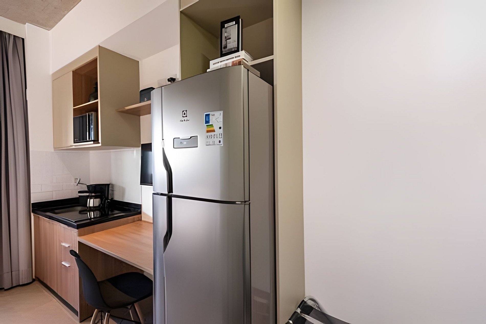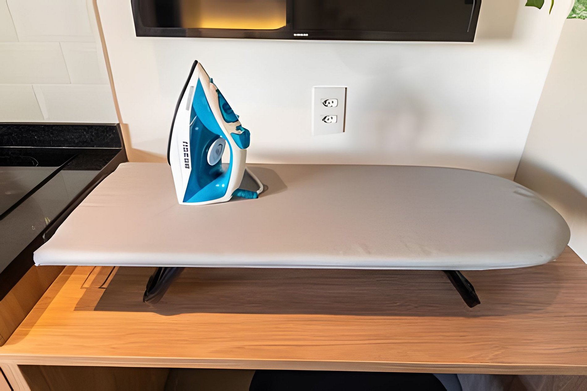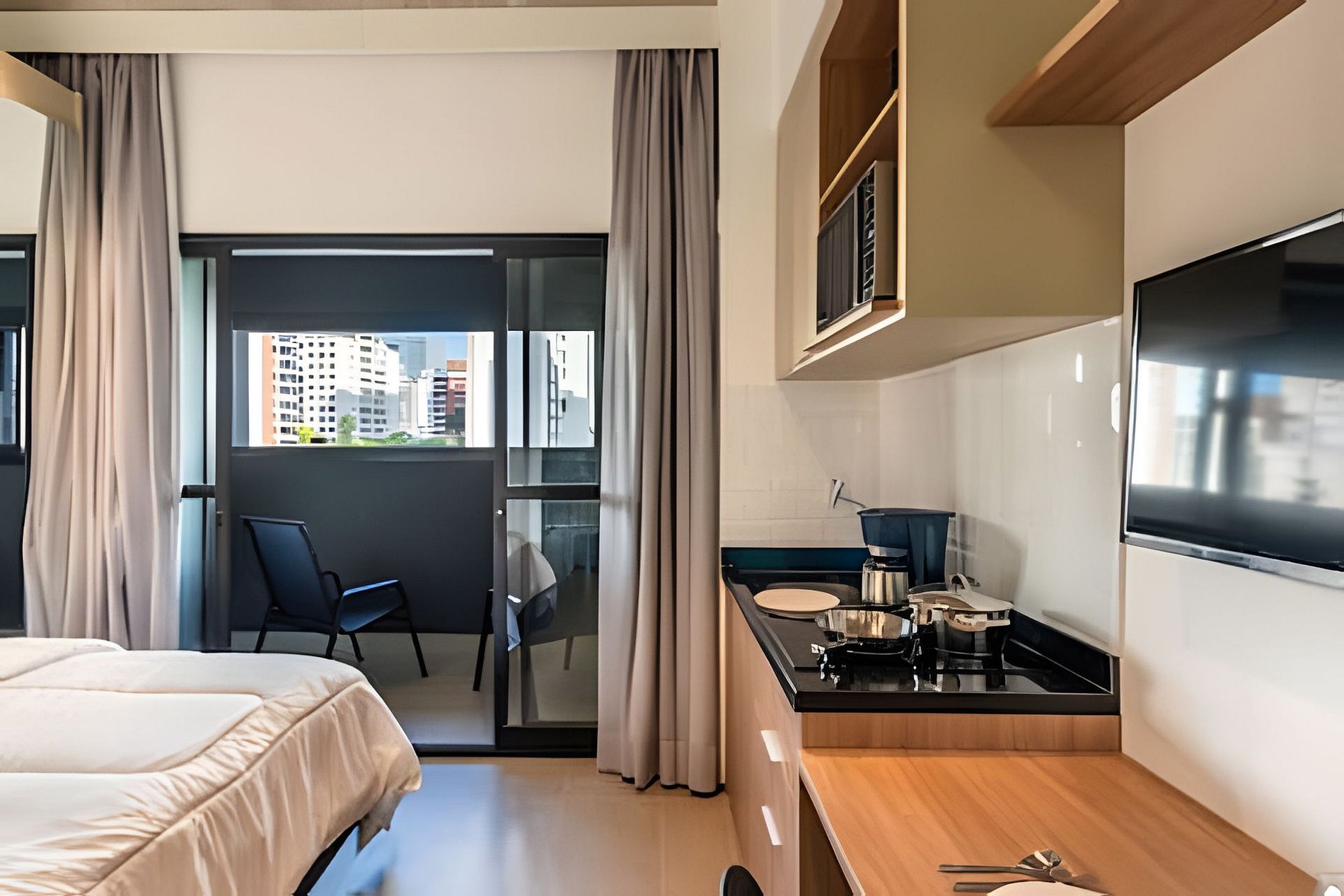 Quarto completo > cama casal padrão > roupa de cama > travesseiros Banheiro completo > ducha com aquecimento central > box blindex > secador de cabelo Cozinha totalmente equipada > geladeira > cooktop > máquina de café > liquidificador > jogo de panelas > jogo de copos > jogo de pratos > talheres Estação de trabalho Fechadura eletrônica Ferro passar roupa