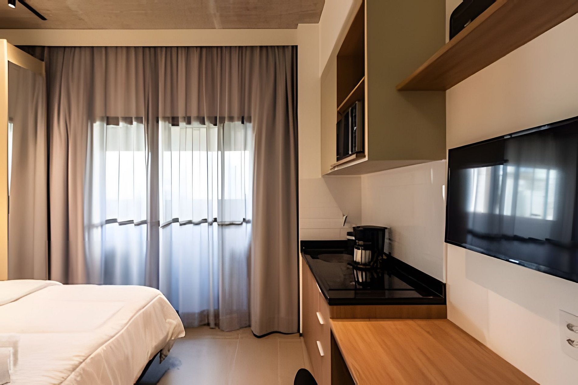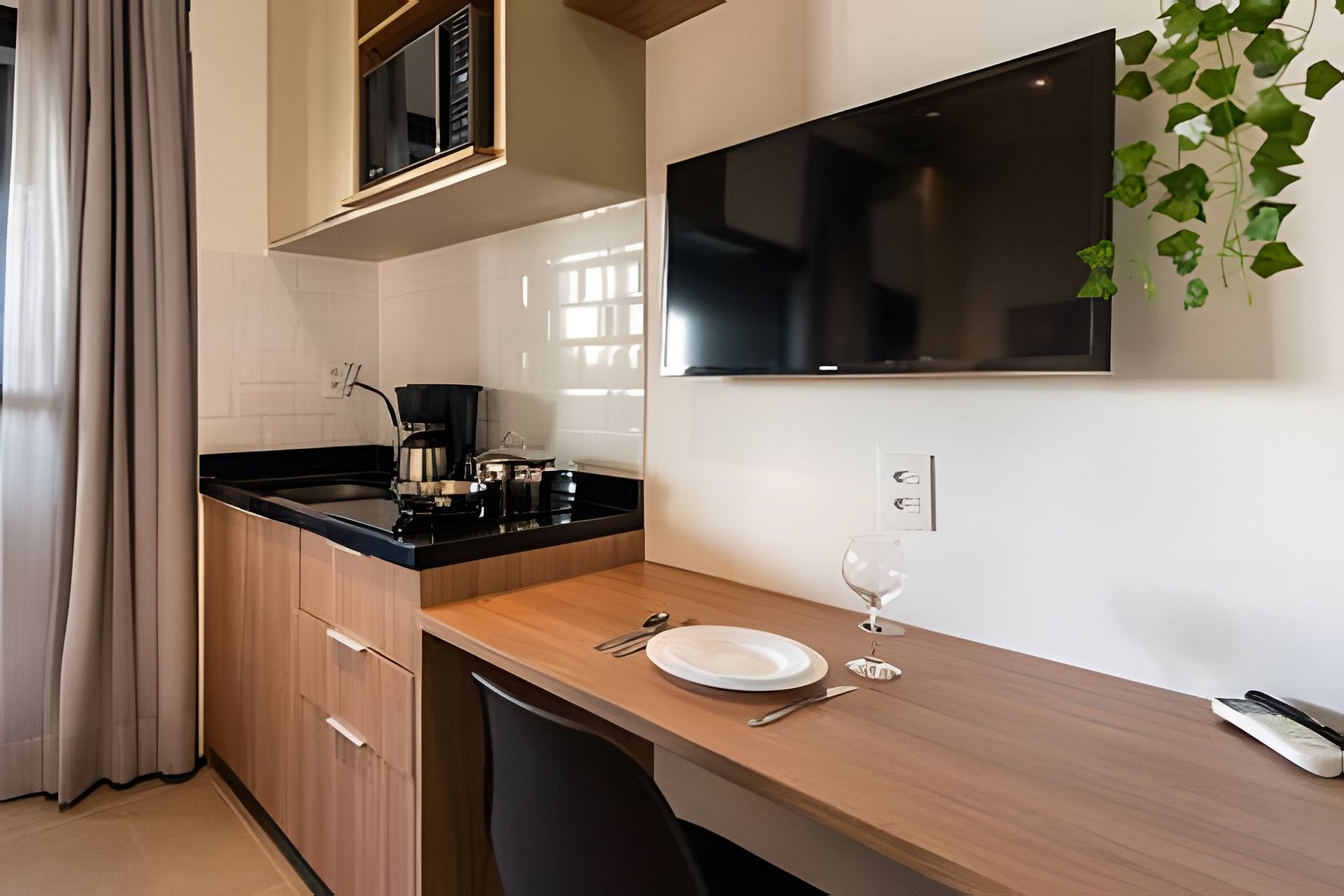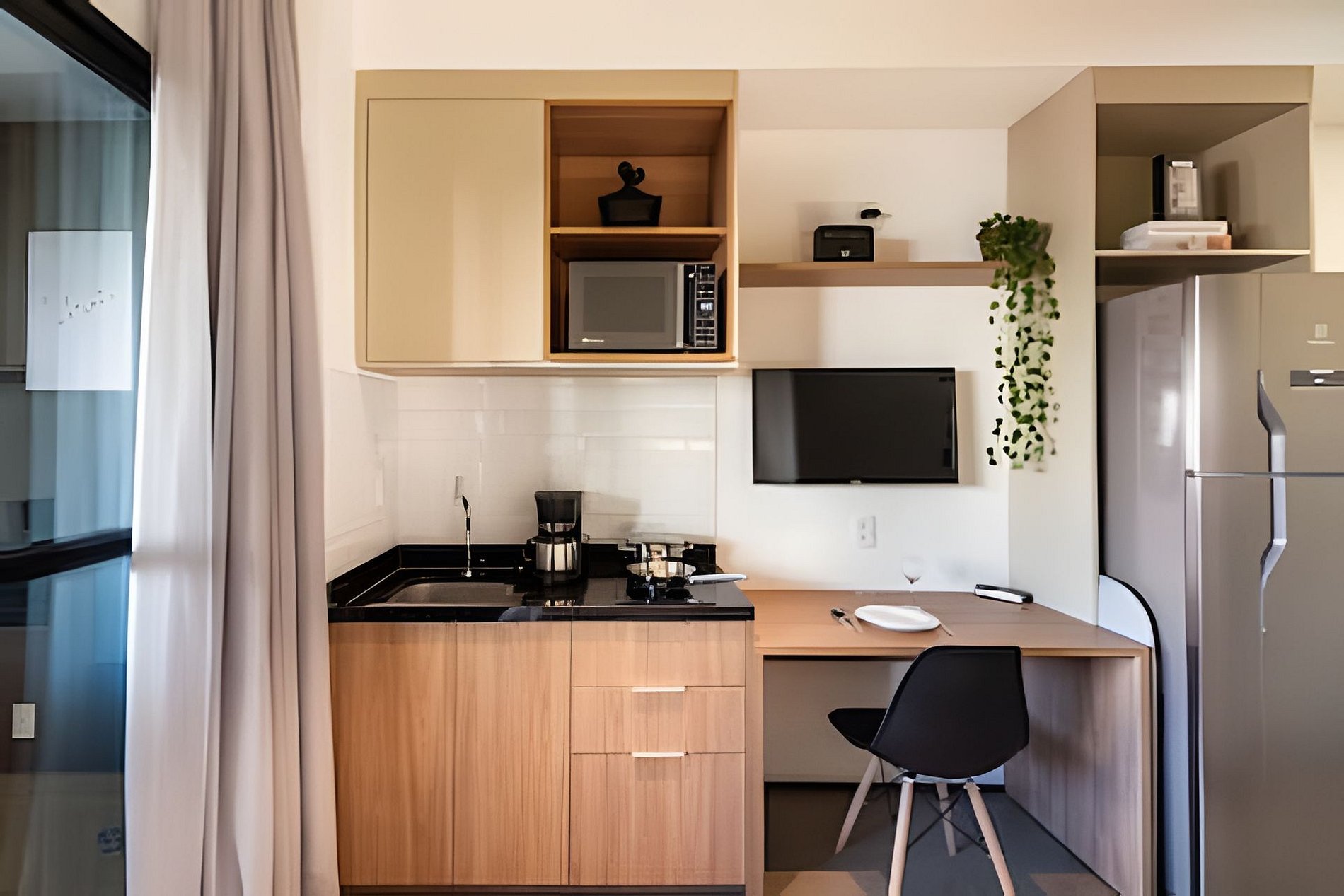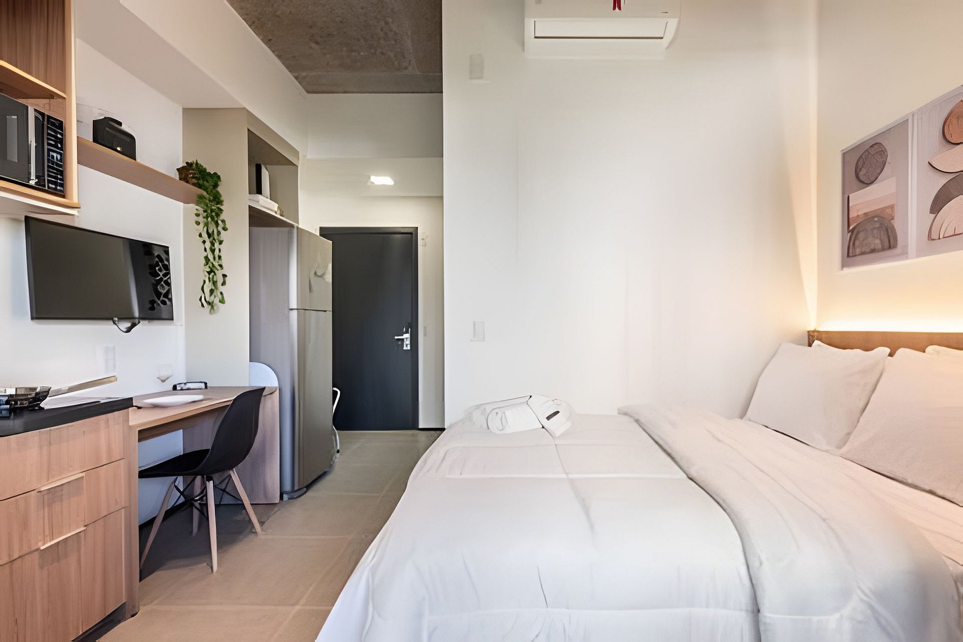 Quarto completo > cama casal padrão > roupa de cama > travesseiros Banheiro completo > ducha com aquecimento central > box blindex > secador de cabelo Cozinha totalmente equipada > geladeira > cooktop > máquina de café > liquidificador > jogo de panelas > jogo de copos > jogo de pratos > talheres Estação de trabalho Fechadura eletrônica Ferro passar roupa