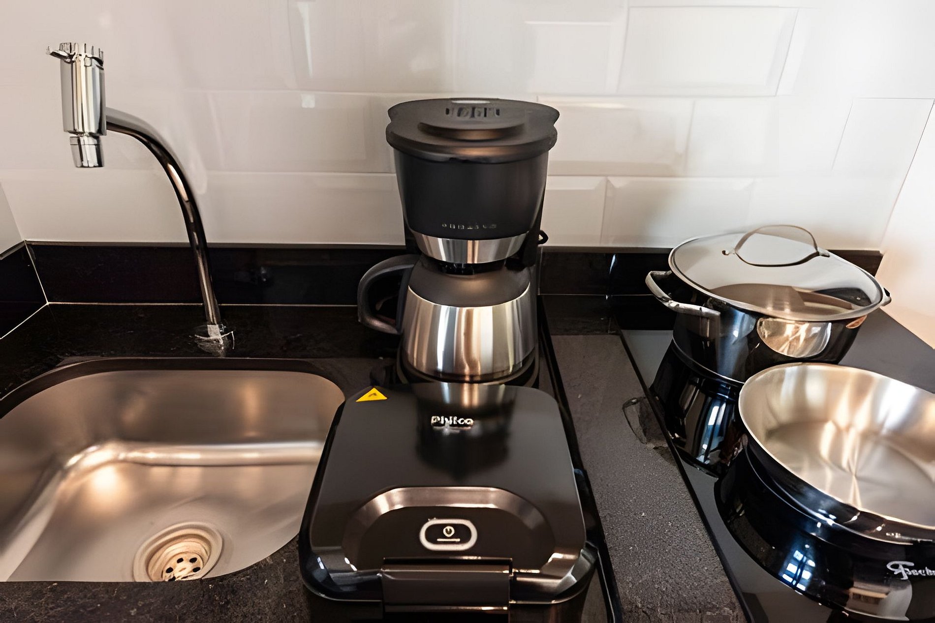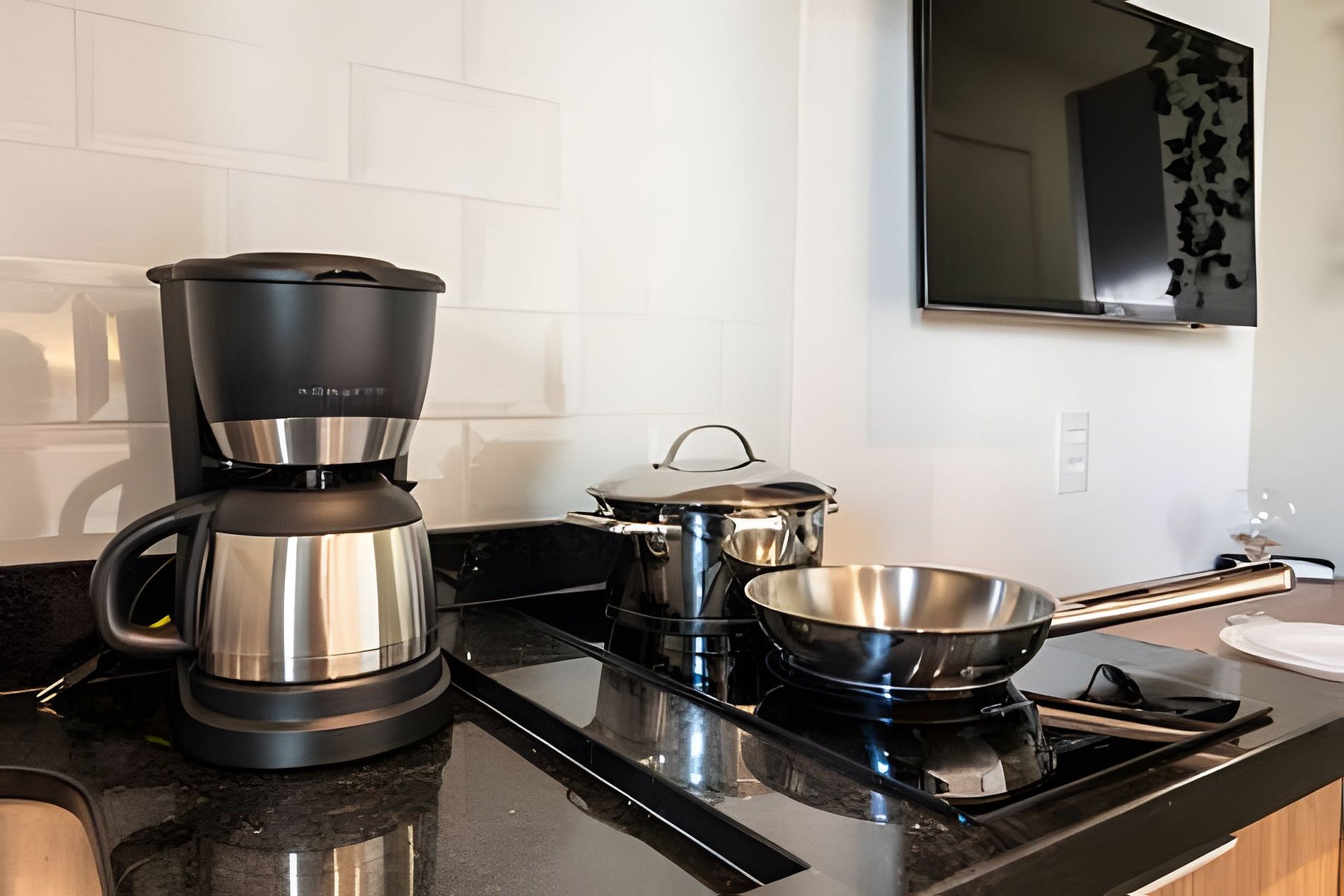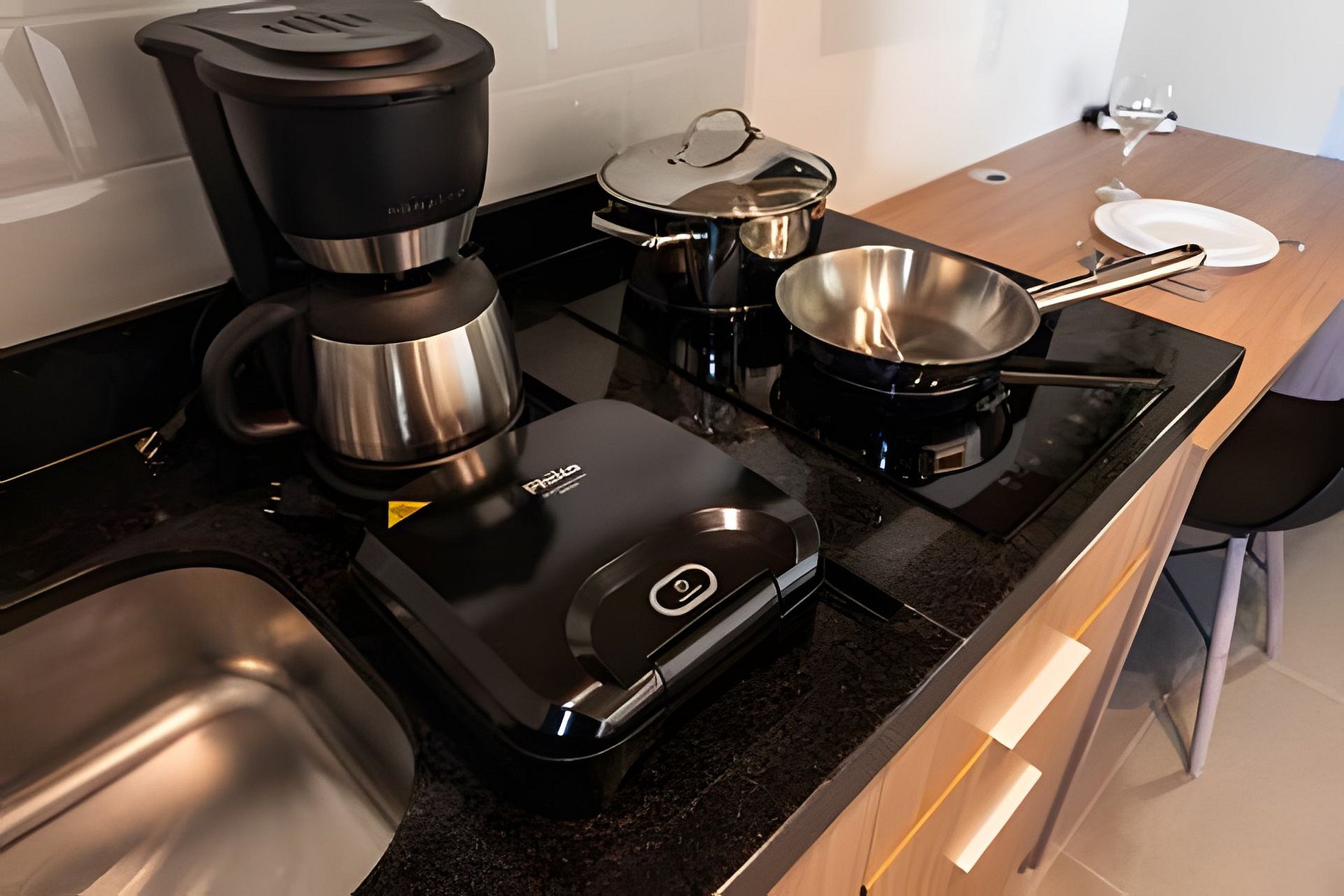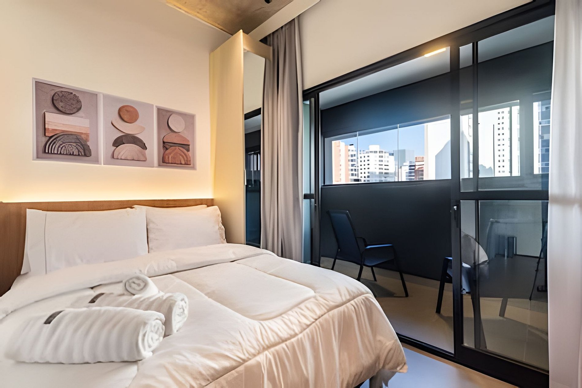 Quarto completo > cama casal padrão > roupa de cama > travesseiros Banheiro completo > ducha com aquecimento central > box blindex > secador de cabelo Cozinha totalmente equipada > geladeira > cooktop > máquina de café > liquidificador > jogo de panelas > jogo de copos > jogo de pratos > talheres Estação de trabalho Fechadura eletrônica Ferro passar roupa