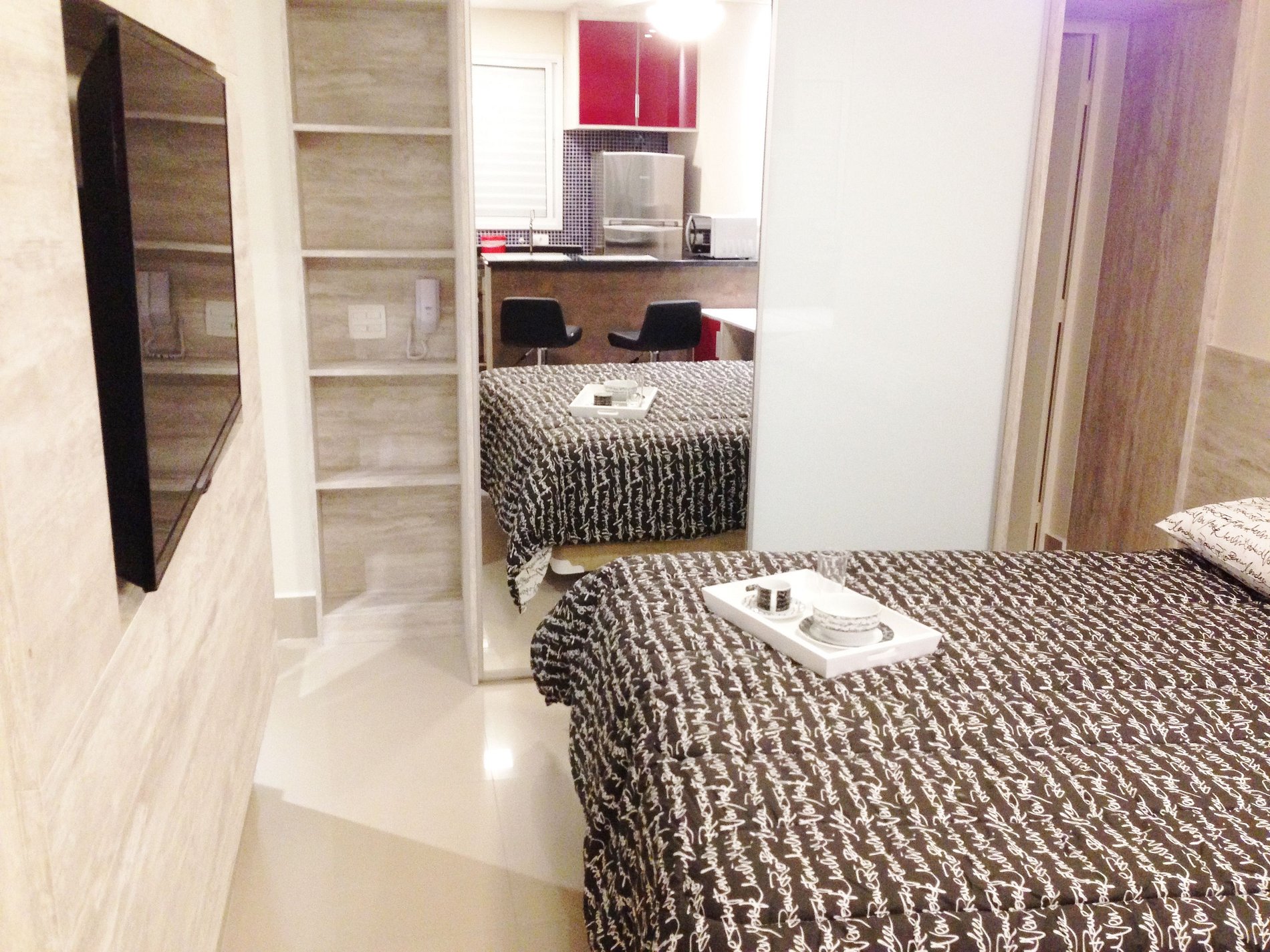 O apto é um studio completo que acomoda até dois adultos e uma criança.