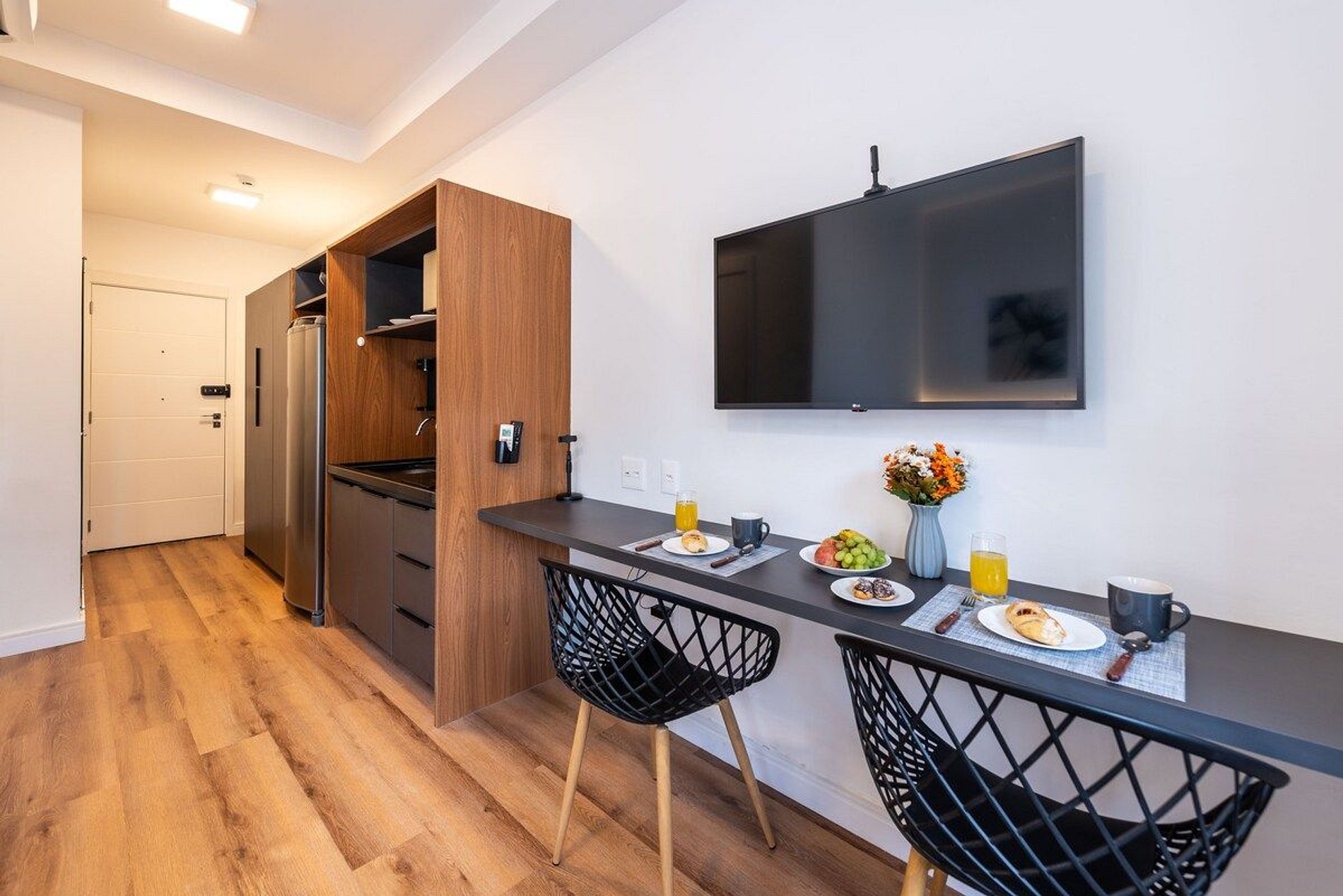 Conforto & Tecnologia > internet de alta velocidade > ar condicionado split > janela com blackout > smart TV com acesso a Apps de Streamings e canais digitais > fechadura eletrônica > maleiro Banheiro completo > amplo banheiro > ducha com aquecimento a gas > box blindex > secador de cabelo Cozinha totalmente equipada > freezer > microondas > cooktop elétrico > cafeteira > sanduicheira > liquidificador > filtro de água > jogo de panelas > jogo de copos > jogo de pratos > jogo de taças > talheres