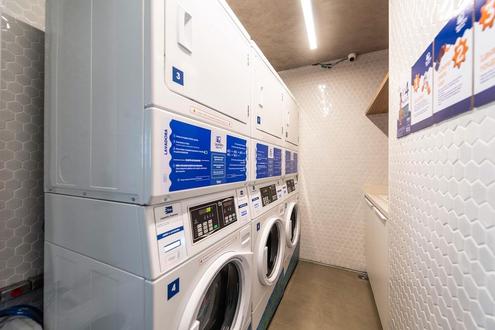Lavanderia com máquinas lava e seca pay per use Espaço coworking Academia Piscina