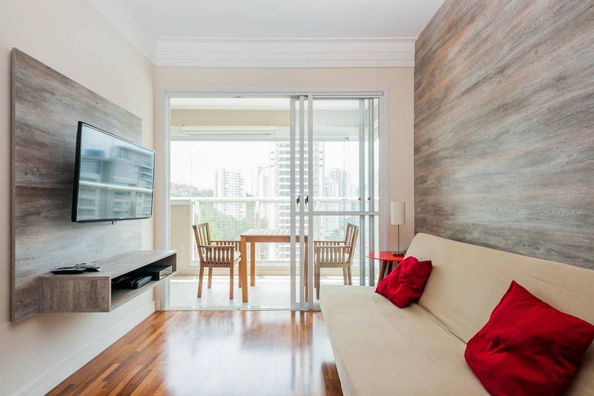 Apartamento com 1 suíte, com 50m2 e ampla varanda com linda vista e fechamento em vidro, cozinha tipo americana. Sofá cama. Persiana black out.