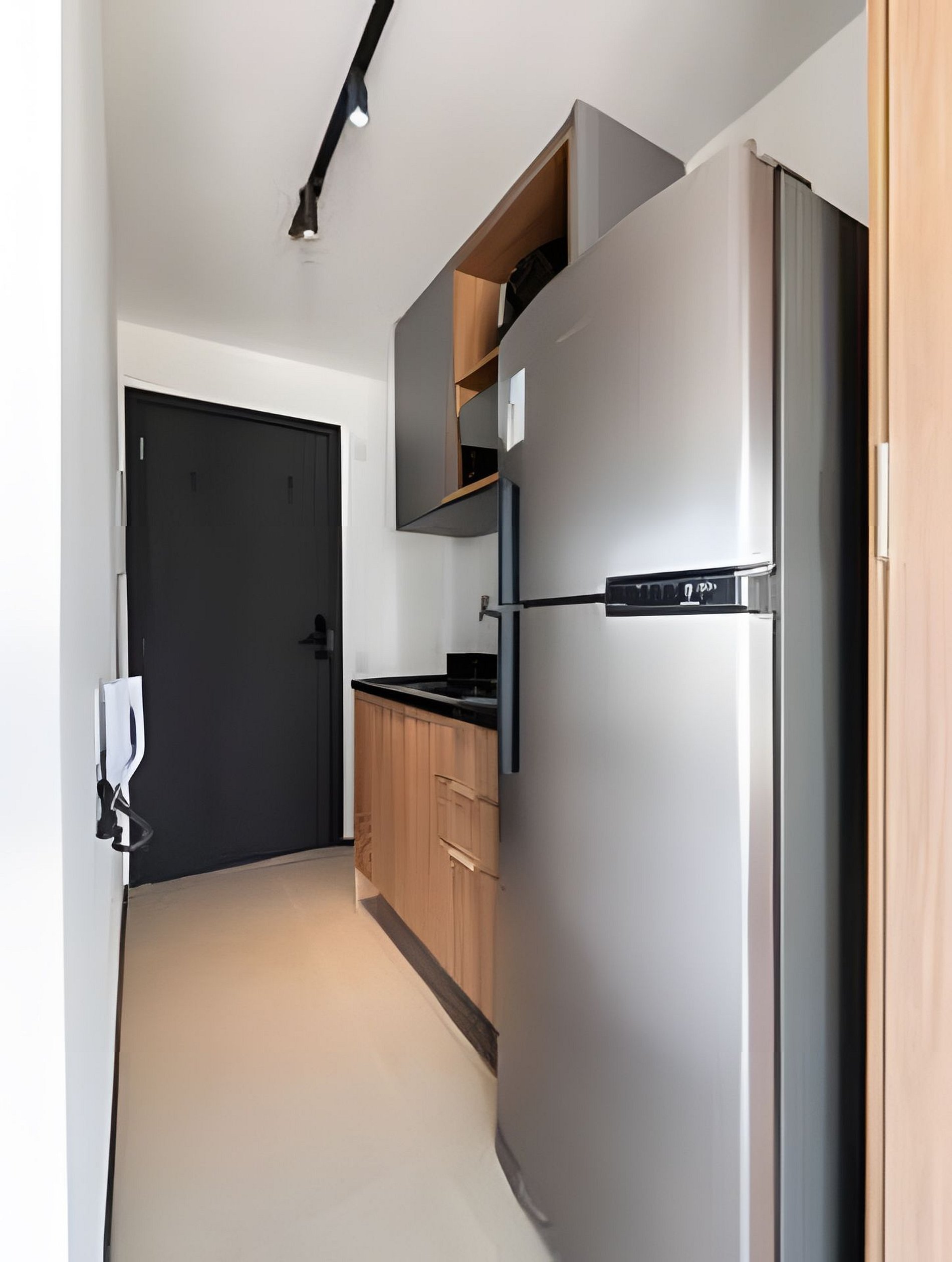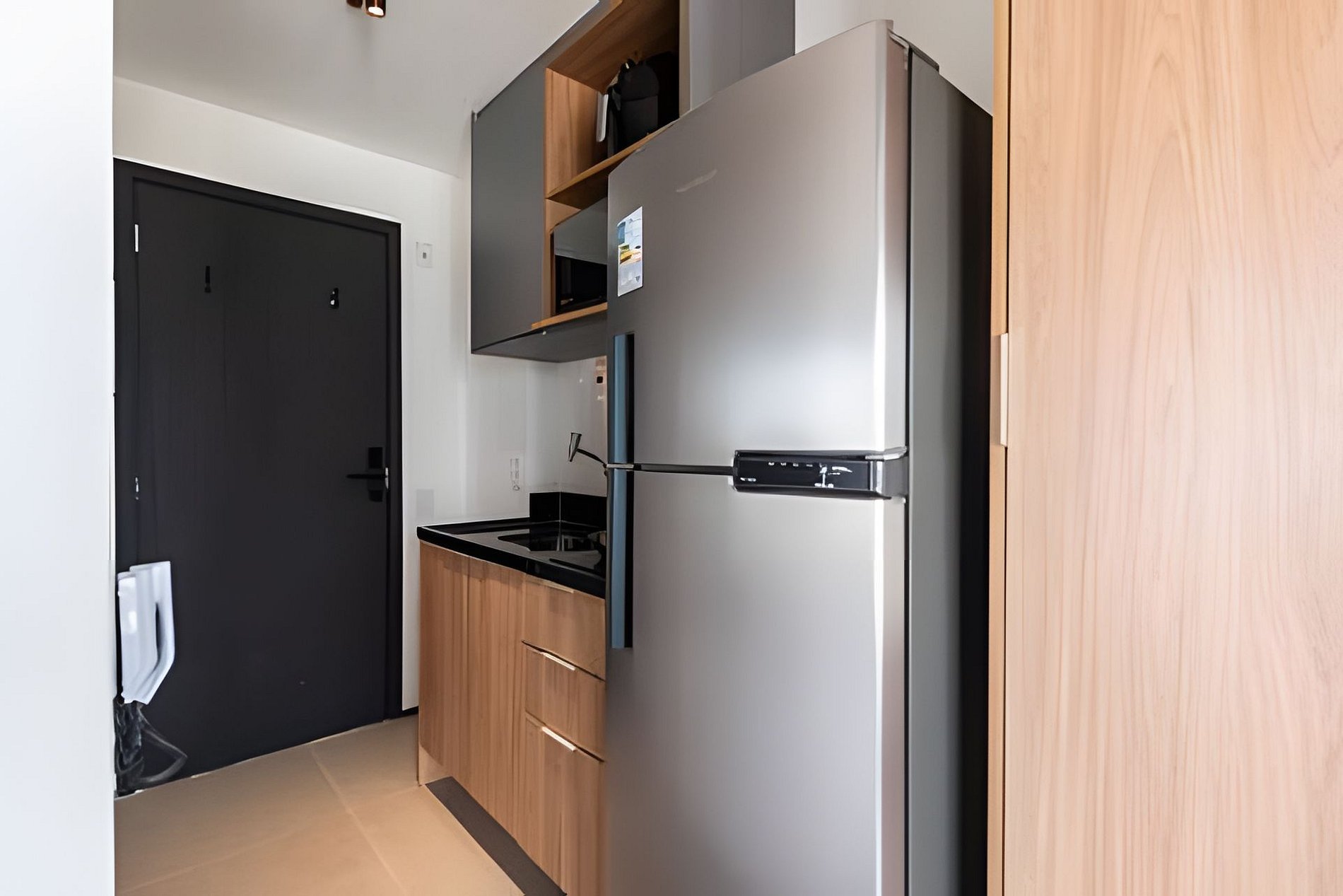 Quarto completo > cama casal padrão > roupa de cama > travesseiros > cortina black out Banheiro completo > ducha com aquecimento central > box blindex > secador de cabelo Cozinha totalmente equipada > geladeira duplex com freezer > microondas > cooktop > máquina de café > air fryer > jogo de panelas > jogo de copos > jogo de pratos > talheres Estação de trabalho Fechadura eletrônica Varanda fechada em vidro Ferro passar roupa