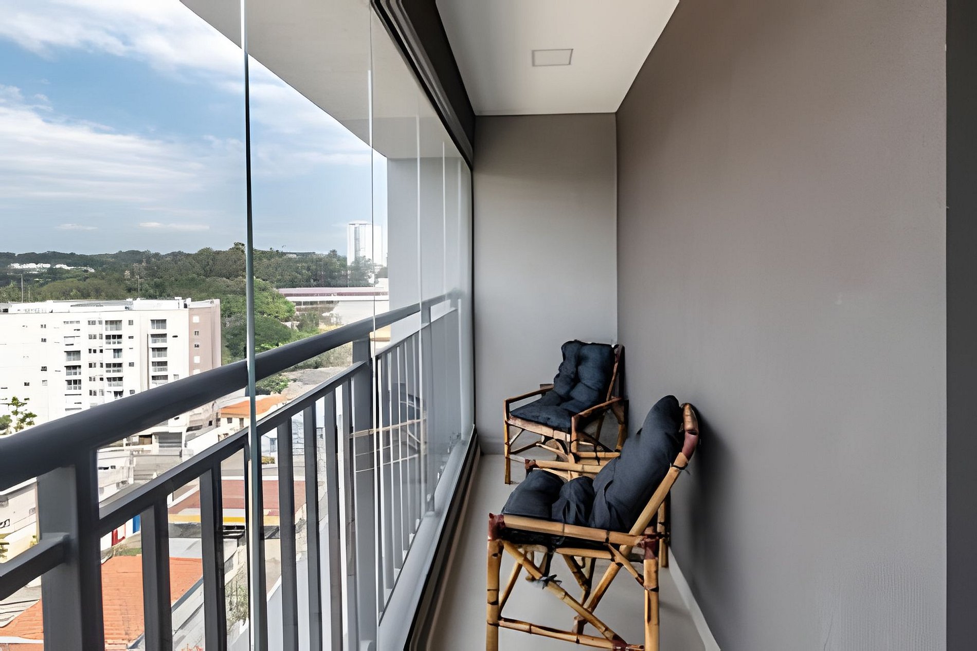 Quarto completo > cama casal padrão > roupa de cama > travesseiros > cortina black out Banheiro completo > ducha com aquecimento central > box blindex > secador de cabelo Cozinha totalmente equipada > geladeira duplex com freezer > microondas > cooktop > máquina de café > air fryer > jogo de panelas > jogo de copos > jogo de pratos > talheres Estação de trabalho Fechadura eletrônica Varanda fechada em vidro Ferro passar roupa